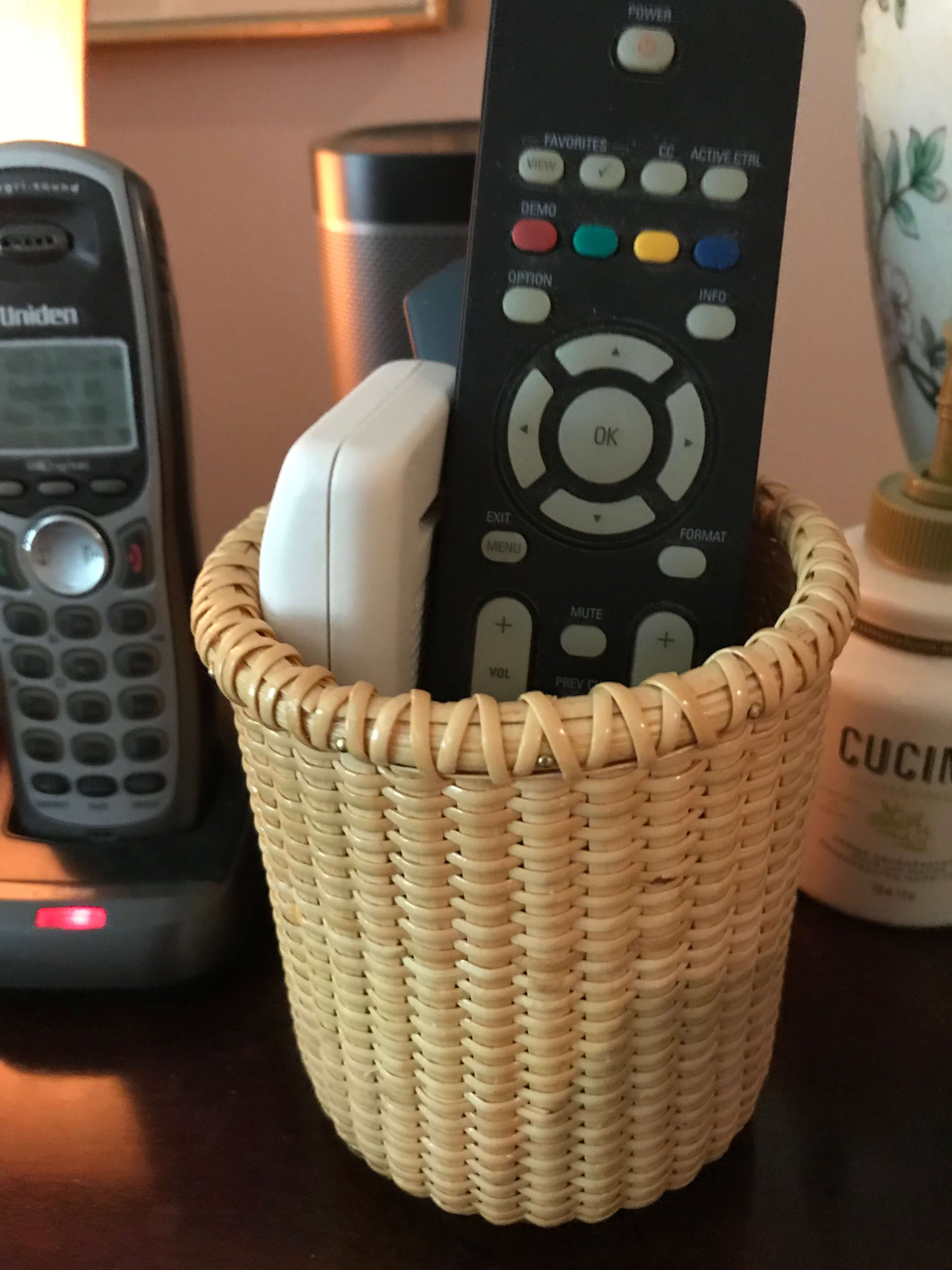 A 5" basket with a cherry base and rim to hold the TV remotes